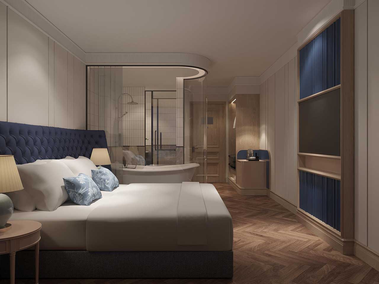 The President Room features a master bedroom with a luxurious king-size bed, a spacious balcony overlooking the city, and a walk-in closet. Guests can unwind in the elegant bathroom with a standing shower and bathtub combination, while a comfortable armchair and dedicated working area provide both relaxation and convenience.